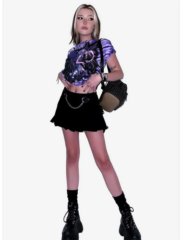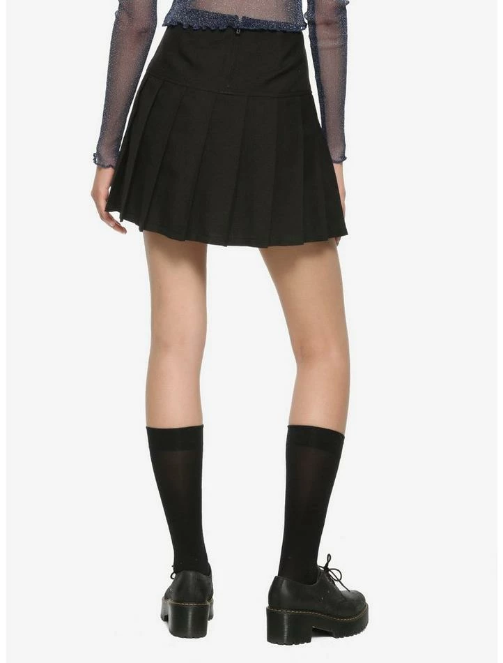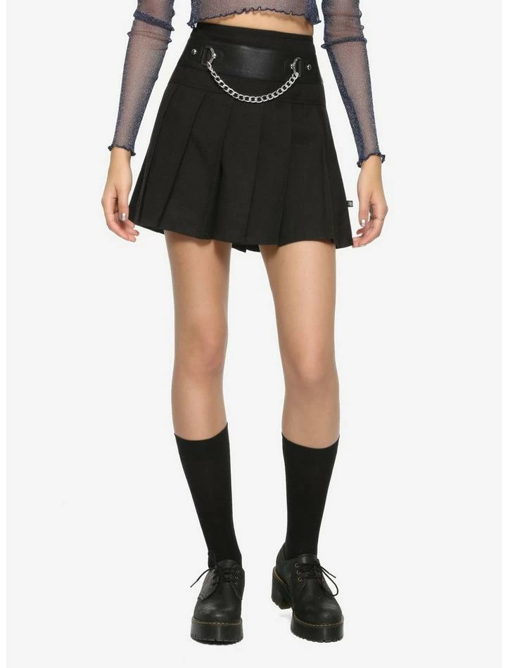 Keep your look tough but cute with this black pleated skirt from Royal Bones by Tripp. The waistband has a faux leather panel with two branded D-rings with a chain between them. Featuring a back zipper closure.