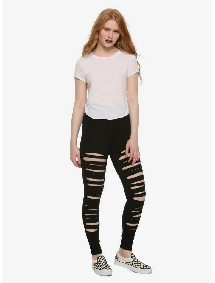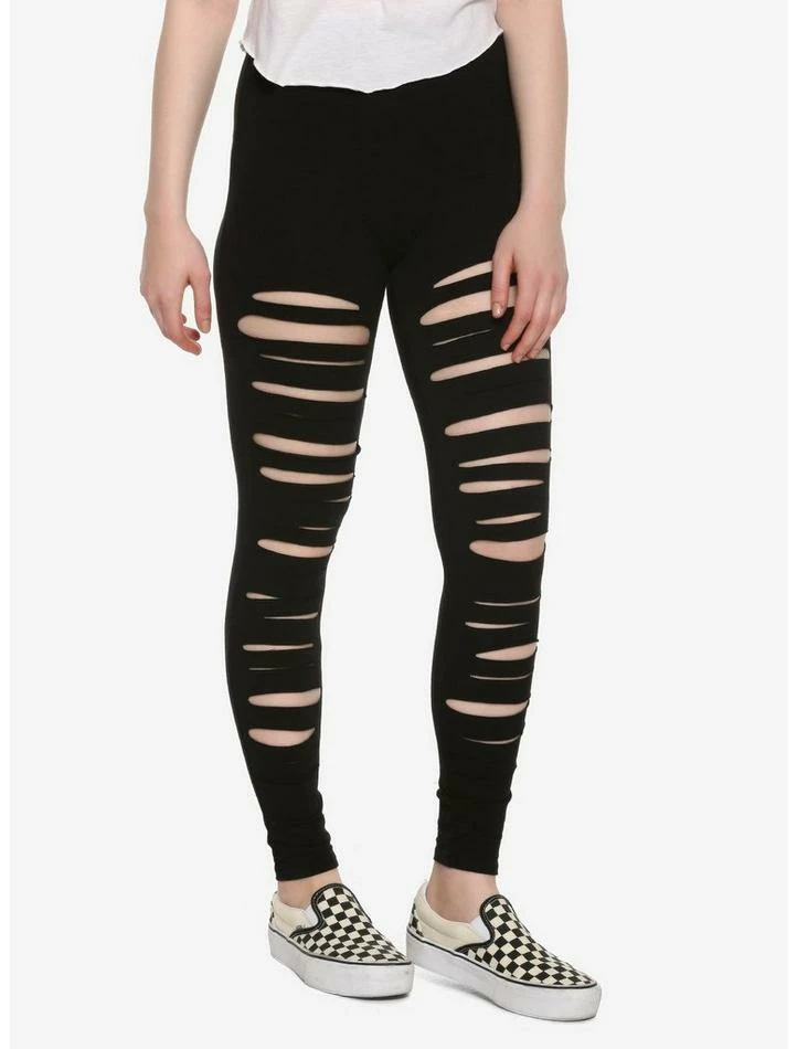 Getting your leggings shredded just right can be a pain. Skip the hassle and get yours pre-shredded! These soft black leggings have carefully arranged horizontal slices down the front of both legs.ย