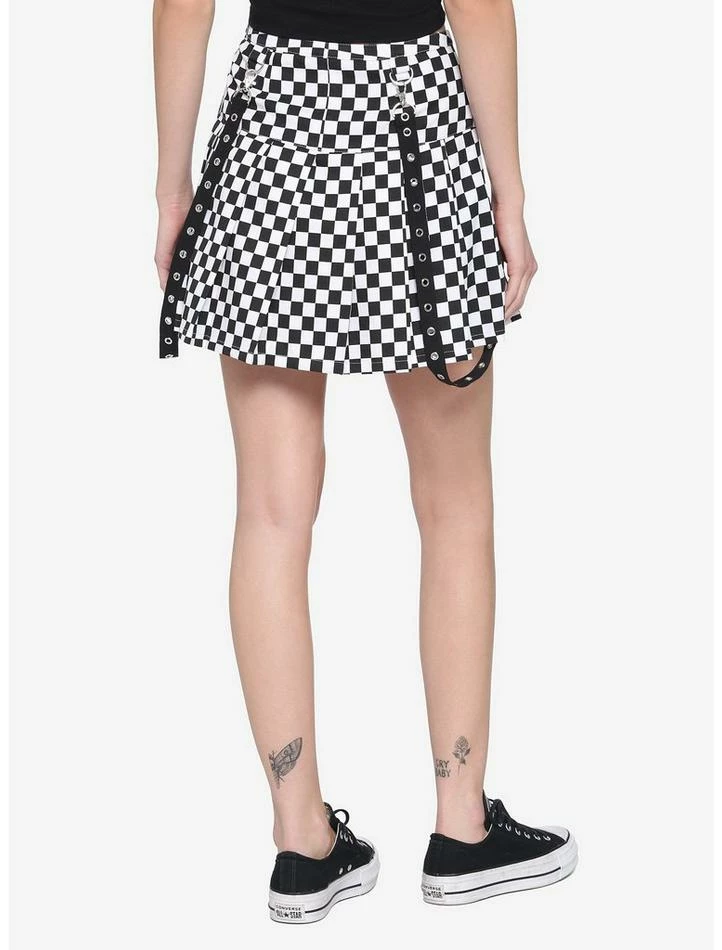 Pleated skirts or suspender skirts? Why not both! This black and white checkered pleated skirt features removable suspenders with silver tone grommets and hardware. Featuring a side zipper closure.