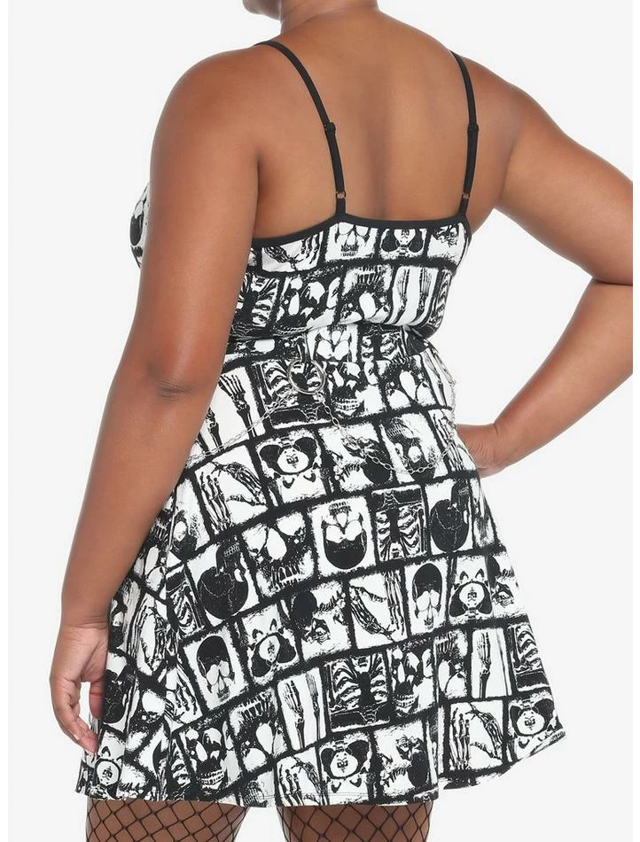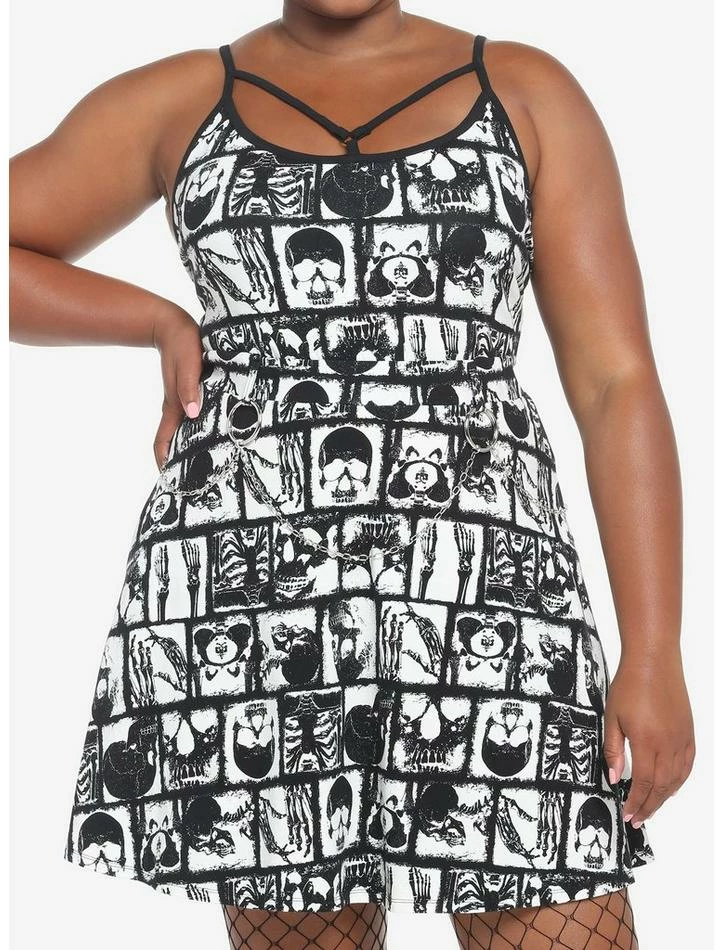 Add some more skeletons to your closet with this strappy dress! Featuring an allover panel print of skeletal anatomy. Comes with a hardware chain belt and strappy detailing across the chest. Side pockets, elasticated waistband and adjustable straps.
