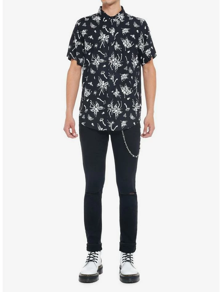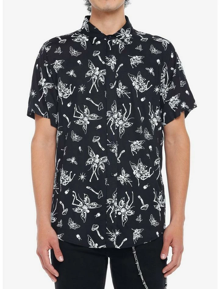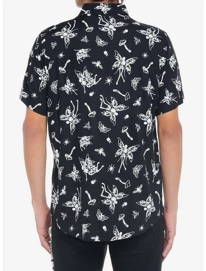 Darkness is a friend of ours — how about you? Channel it with this woven button-up featuring an allover print of skeleton fairies, mushrooms and death’s-head moths.