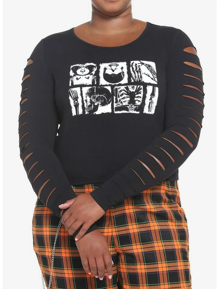 Add more skeletons to your closet with this long-sleeve top! Featuring slashes down the sleeves for a punk edge and panel prints of different skeletal anatomy.