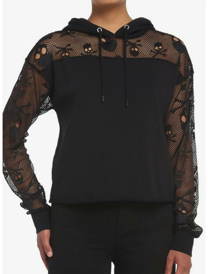 Give off “don’t talk to me” vibes with this hoodie. It features mesh shoulders and arms with skulls and crossbones knitted into it. It’s got a drawstring hood and dropped, raw hem.