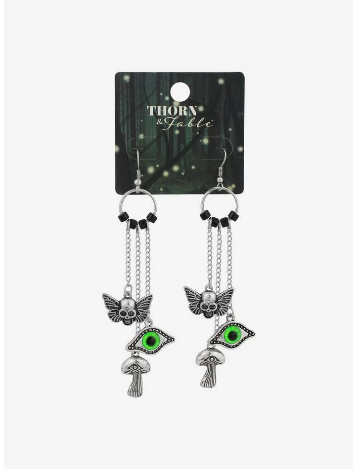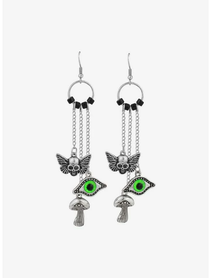 We’re keeping an eye out for these earrings to add to our collection! Add something mysterious to your jewelry lineup with these drop earrings, featuring charms of winged skulls, green eyes and mushrooms.
