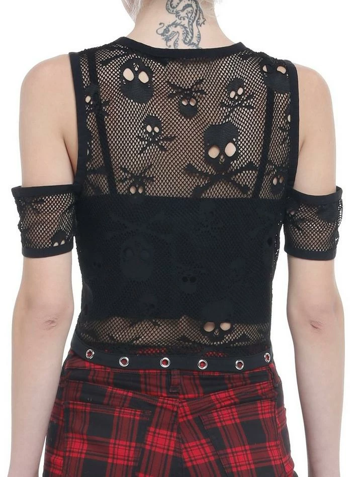 Add some more skeletons and punk vibes to your closet with this mesh top! This cold shoulder crop top has a black cami under layer, and different sized skulls stitched into the fishnet layer. Comes with grommet holes along the waist hem.