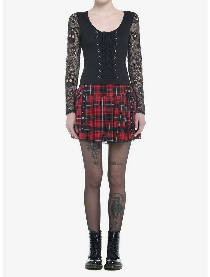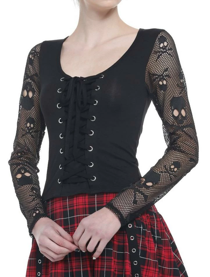 Need a long-sleeve top that’s goth but also a little romantic? This one has fishnet sleeves with skulls woven in, with lace-up detail on the front.
