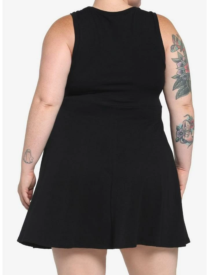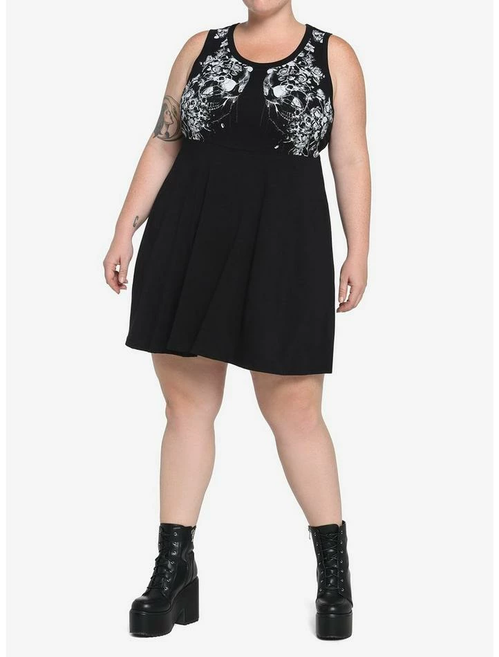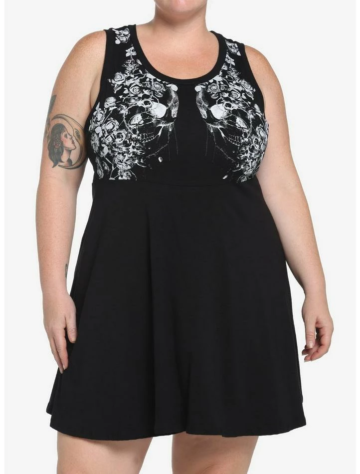 Keep your wardrobe from becoming bare bones by adding a new dress to your rotation! This black, skater dress features skulls printed on the bust, entwined in roses and vines with thorns. Perfect for keeping you cool, while looking cool.
