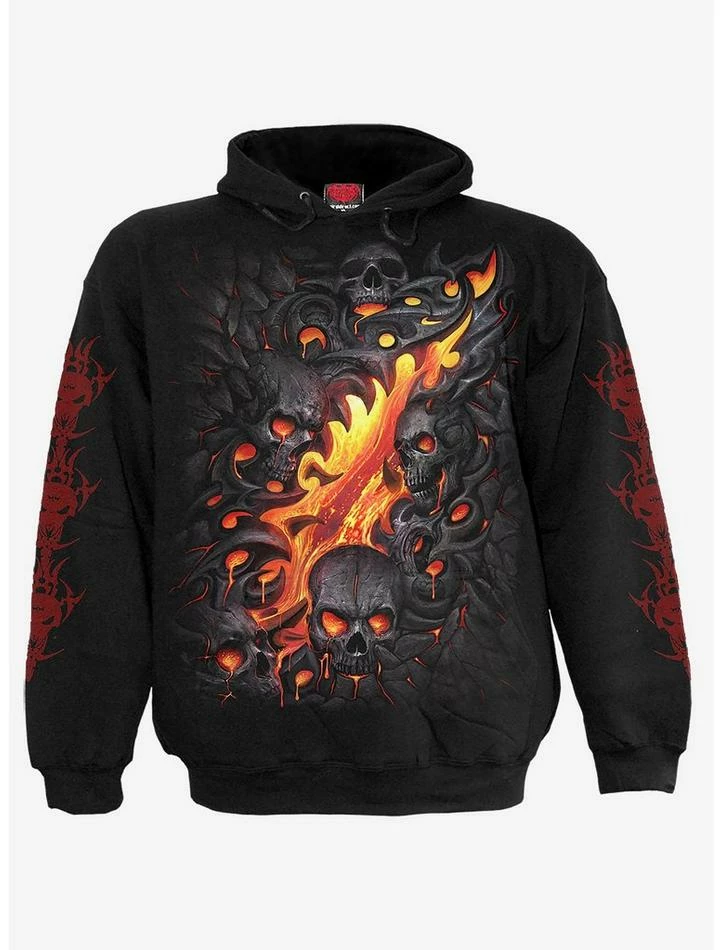 Etched into the melting volcanic rock within the earth’s core, the grotesque mask of death smiles grimly with eyes of molten lava. A skull and tribal back print sets off this eery design perfectly. This hoodie is made of top quality cotton fleece, using skin friendly, Azo-free, reactive dyes.
