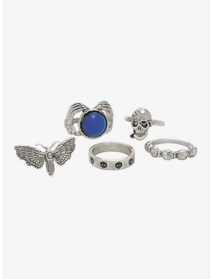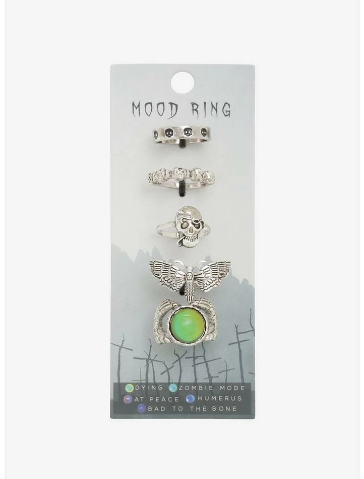 Feeling like you’re dying, in zombie mode, at peace, humerus (get it?) or bad to the bone? Let the mood stone tell you! This silver tone ring set features skeletal hands holding the mood stone, a moth with a skull, a skull with a snake going through it and more!