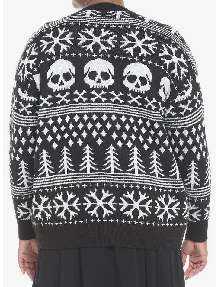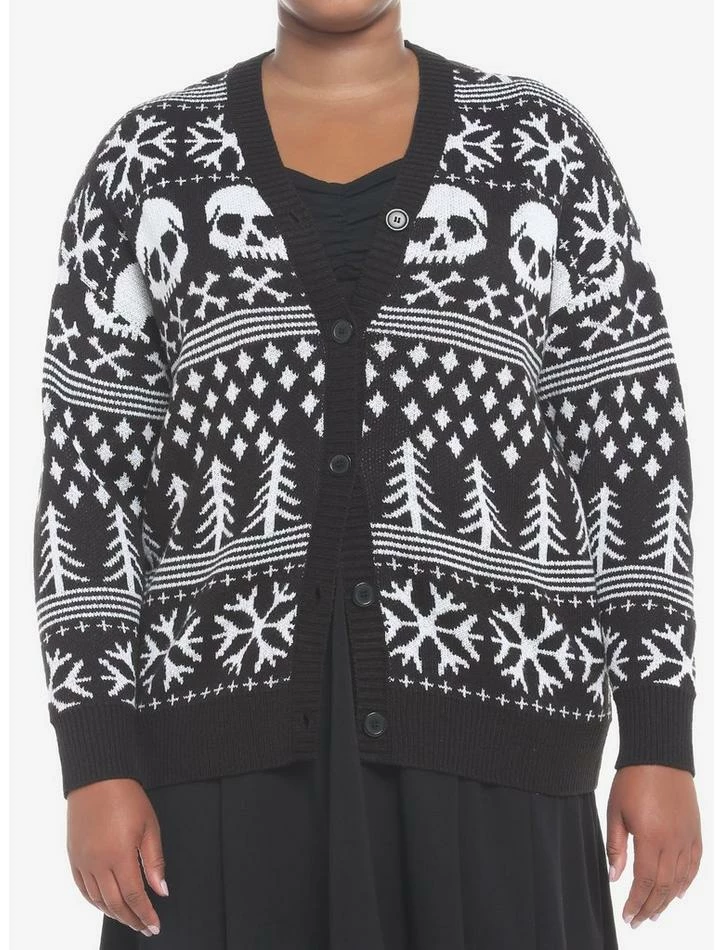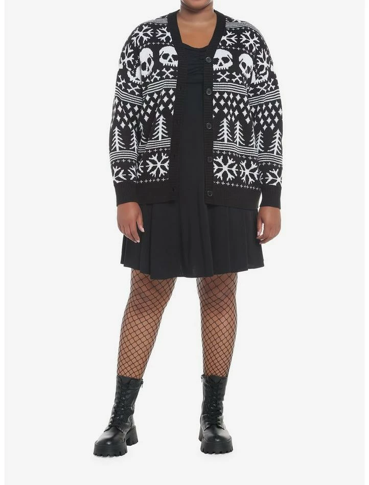 Love the holidays but don’t want to brighten up the way you dress? This fair isle sweater is just your style. It features classic symbols like snowflakes and pine trees, but with skulls and crossbones mixed in. It has an oversized fit and button-down front.