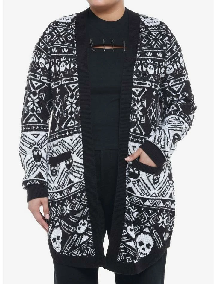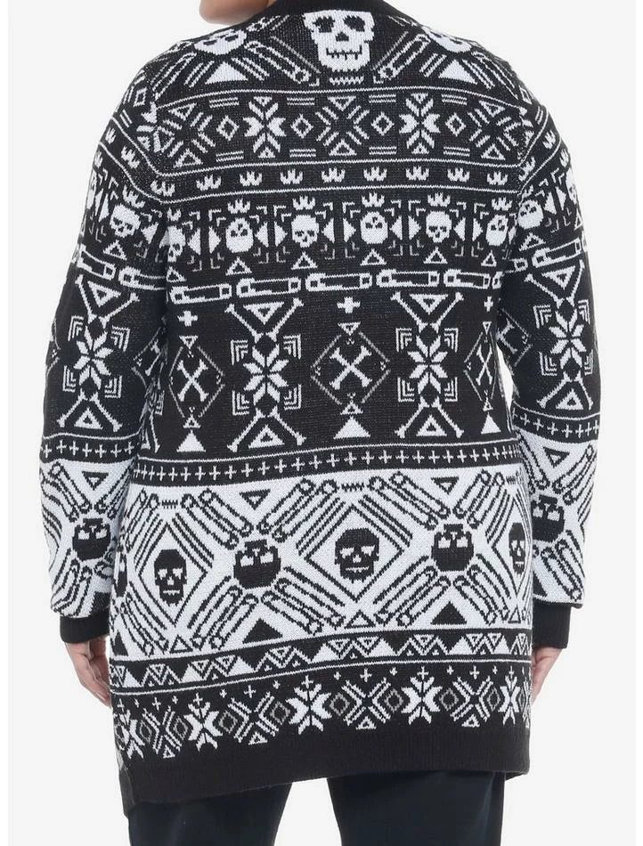Show everyone your dark side — but with a holiday twist. This open cardigan is knit with a skull-inspired fair isle pattern.