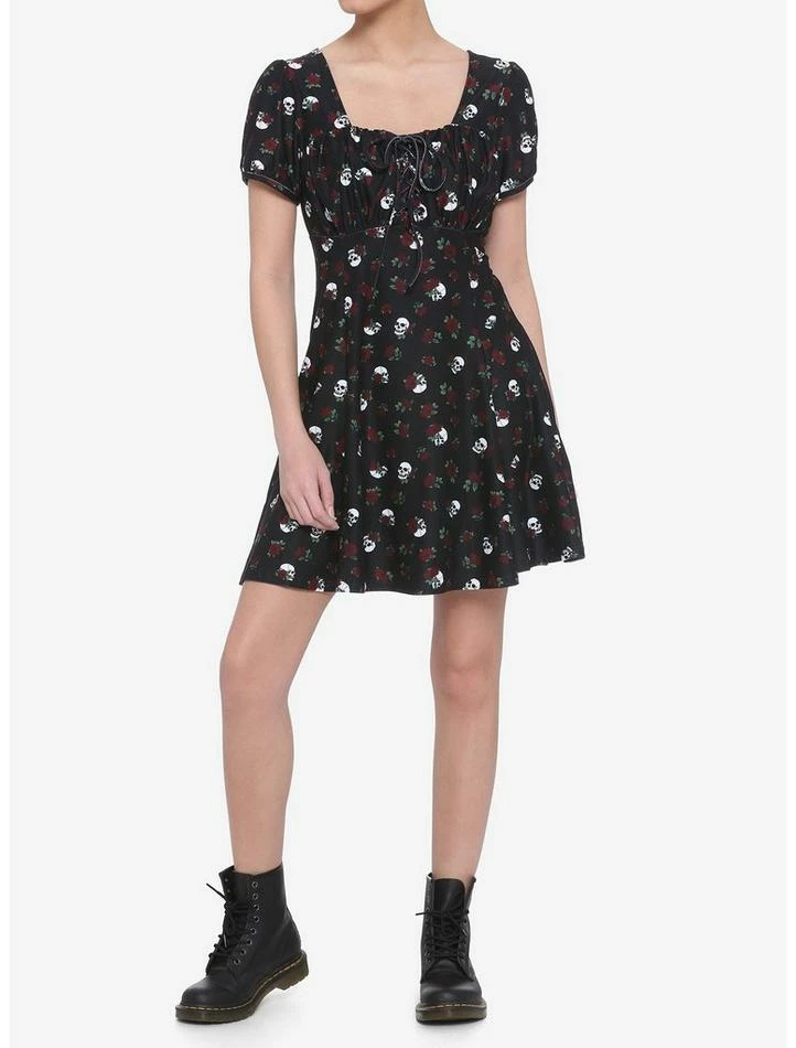 Feel classically cute in this roses and skulls print dress. With gathered sleeves, ruched bust and empire lines, you’ll feel as pretty as a picture! Featuring hip pockets and front bodice lacing.