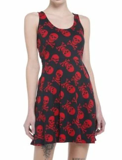 ย We welcome any new way to get more skulls into our looks. This tank dress features an allover print of skulls and crossbones with hearts and broken hearts in their eyes. Comes with pockets.