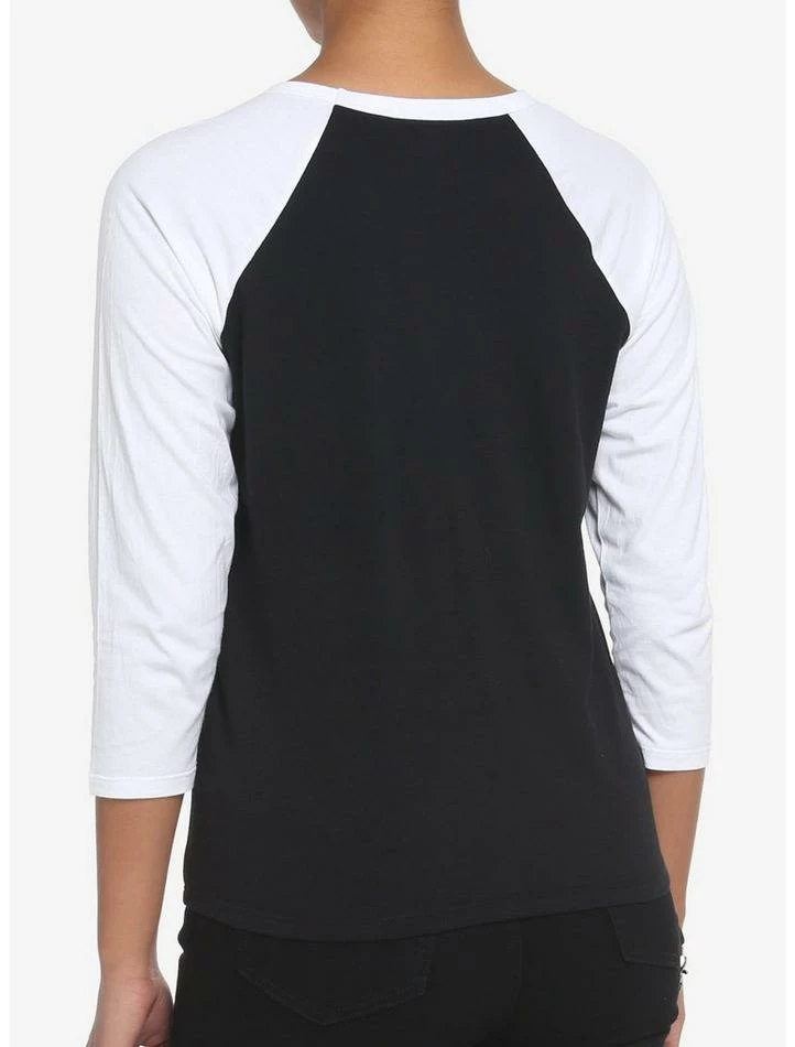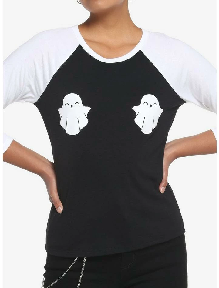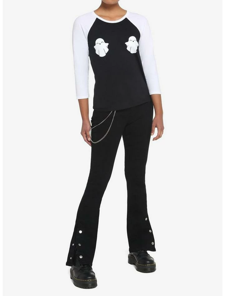 Calling all ghoulfriends, this tee’s for you! Stay lookin’ boo-tiful with this black & white raglan tee, featuring smiling ghosts on the chest and contrast white raglan sleeves.