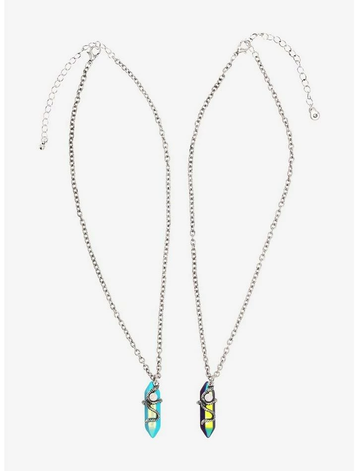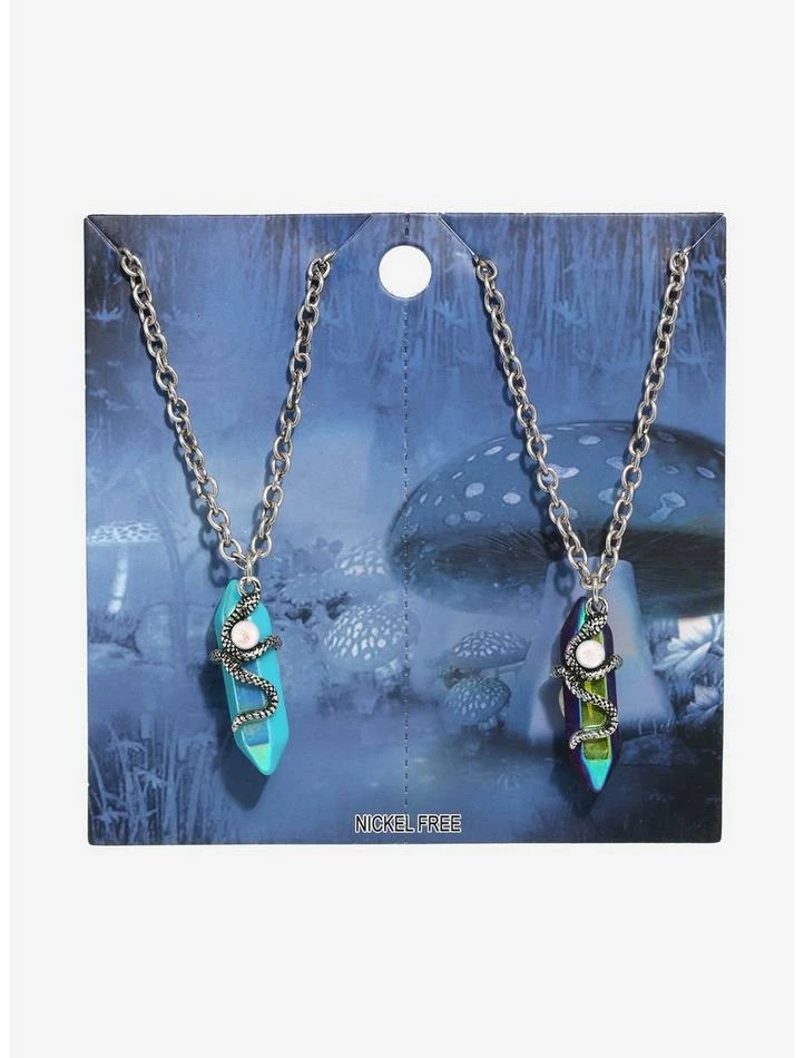Ssssso obsessed with your BFF? Show off your friendship with this silver-tone pair of bestie necklaces! With one synthetic blue crystal and one synthetic purple crystal, both necklaces feature snakes with an opalescent gem wrapped around each crystal.