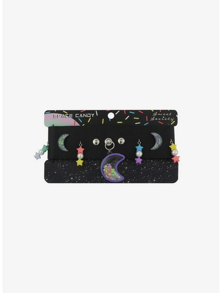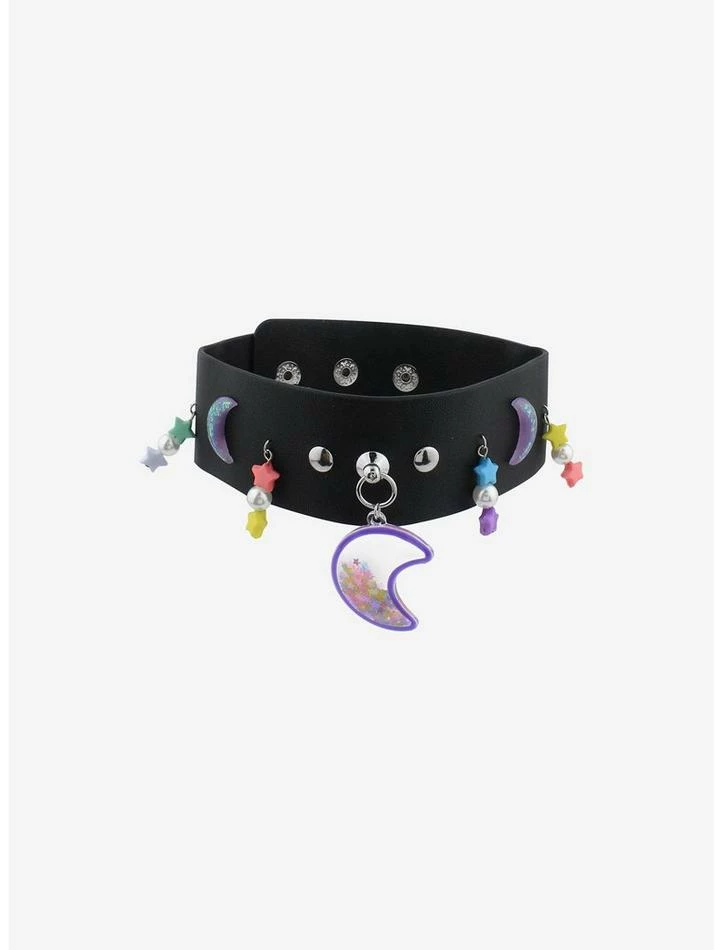 Make some space in your jewelry collection for this fun piece! This black, faux leather choker features pastel moon and star charms with pearlescent detailing. Plus, a crescent moon statement charm filled with glitter. Complete with a snap button closure.