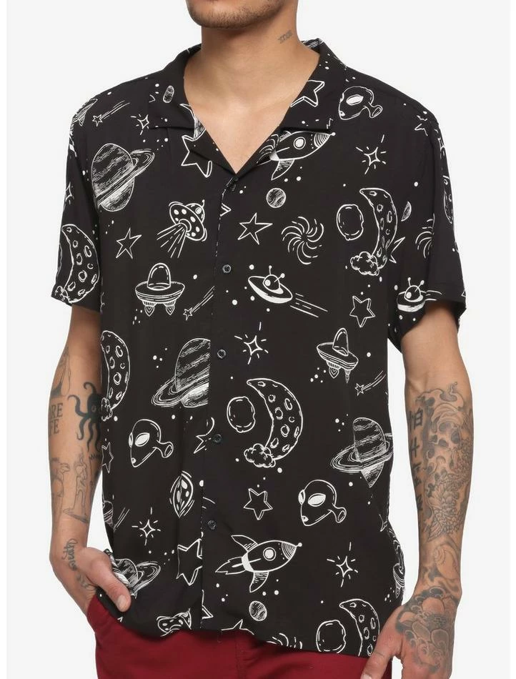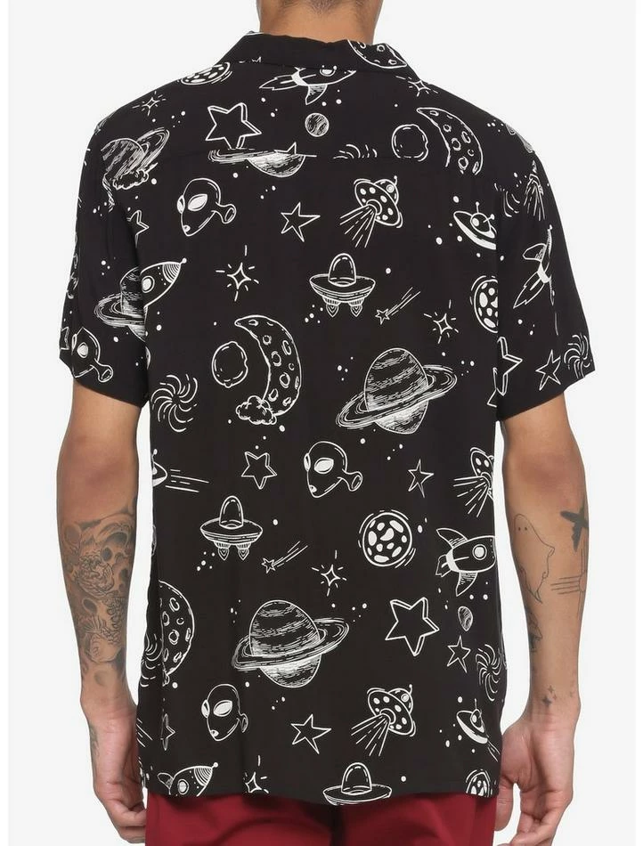 Make some space in your closet for this outta this world button-up! Featuring an allover white outline print of stars, planets and UFOs. Perfect for any Earthling festivities.