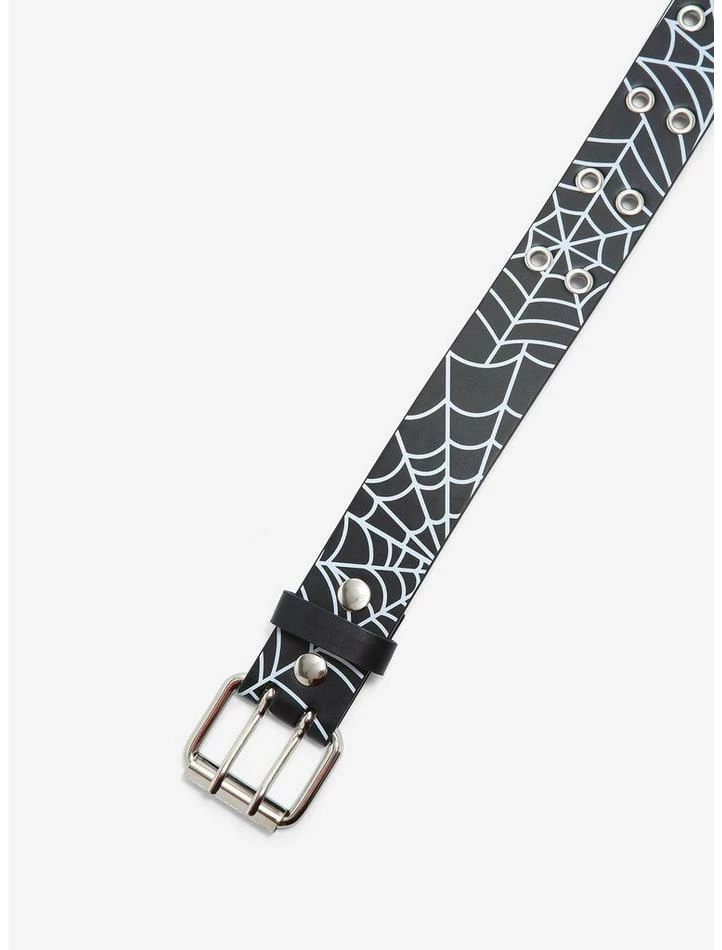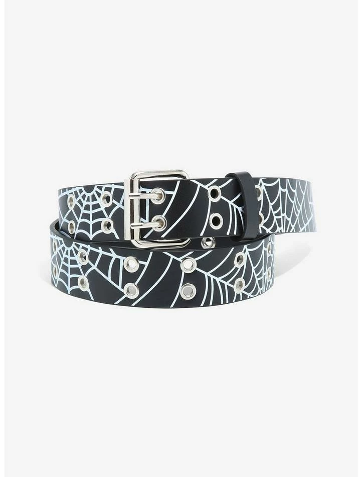 Style feeling buggy? Get back on track with this spiderweb grommet belt! Features white spiderweb design and two rows of silver tone grommets.