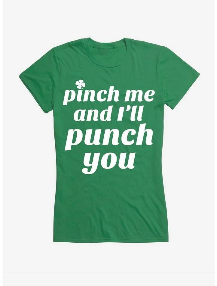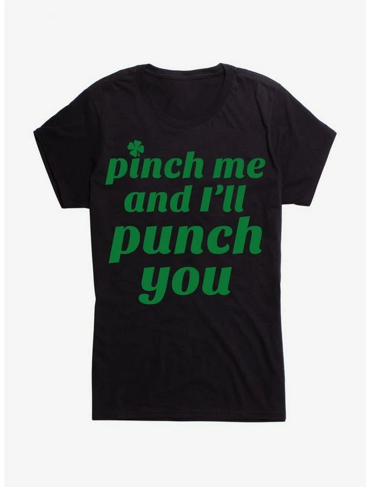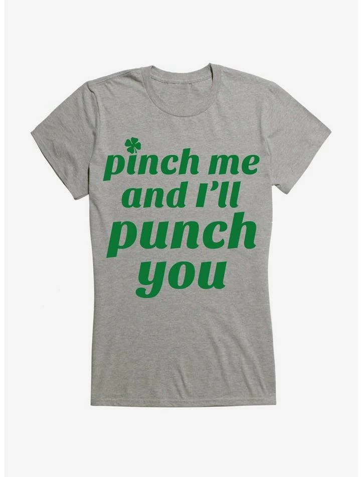 Let ’em know their luck’s about to run out! This fitted graphic tee has “Pinch me and I’ll punch you” and a four-leaf clover.