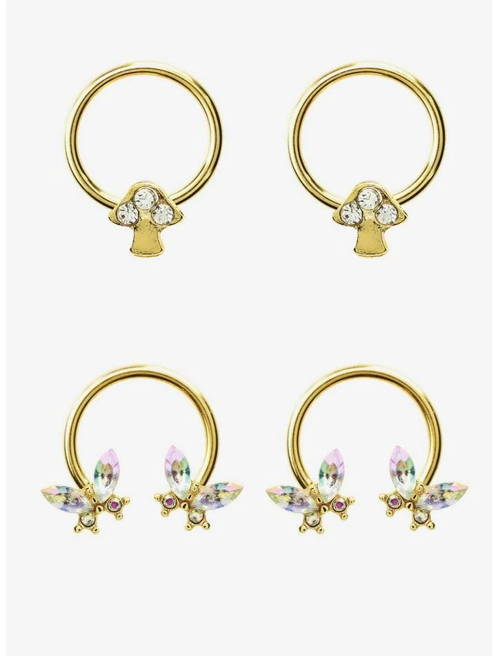 Add a touch of nature to your body jewelry! This set includes a pair of gold-tone captive hoops with gem-filled mushrooms, plus a circular barbell set with iridescent butterflies.