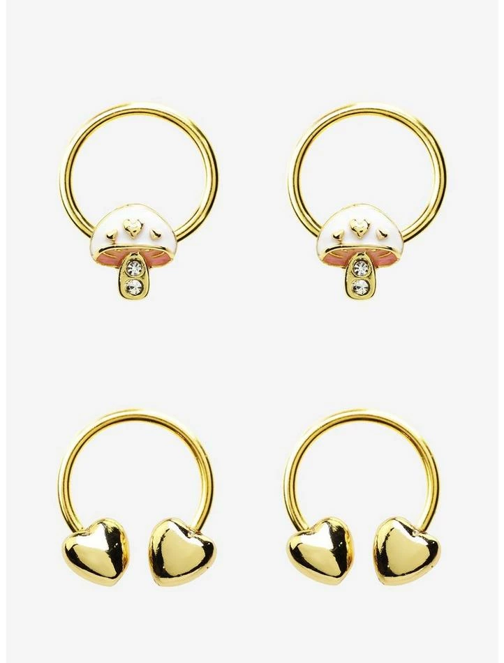 Make some shroom for more body jewelry! This gold-tone set features captive hoops with pink mushrooms with CZ accents and circular barbells with hearts on the ends.