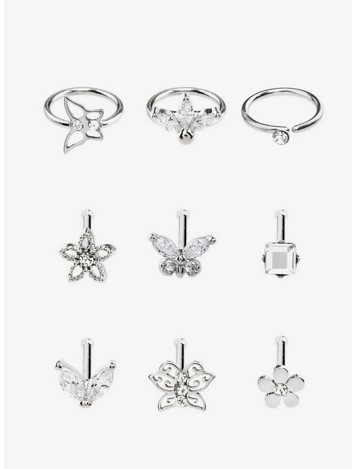 This silver-tone set is just waiting to flutter into your body jewelry collection! Includes nose studs and hoops featuring butterfly and flower detailing, plus CZ accents.