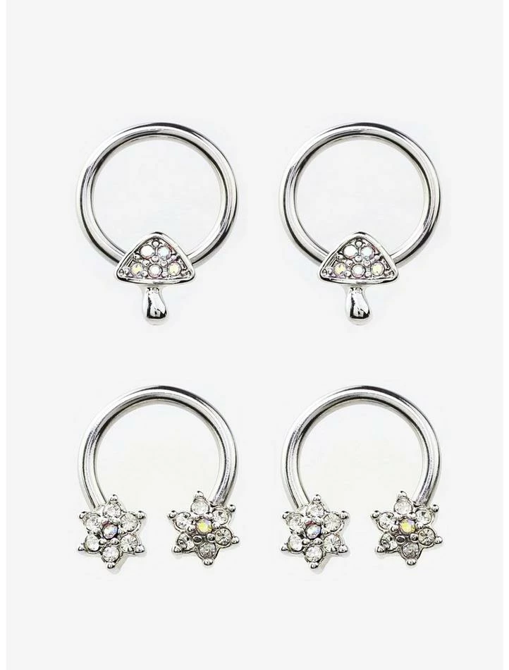 These super cute pieces are ready to make your body jewelry collection bloom! This set features silver-tone captive hoops and curved barbells with bejeweled mushrooms and flower ends, filled with CZ gems.