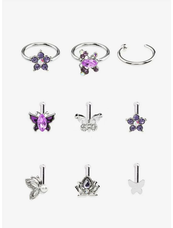 Need new nose pieces? This silver-tone set features studs and hoops with butterfly and purple faux crystal detailing.