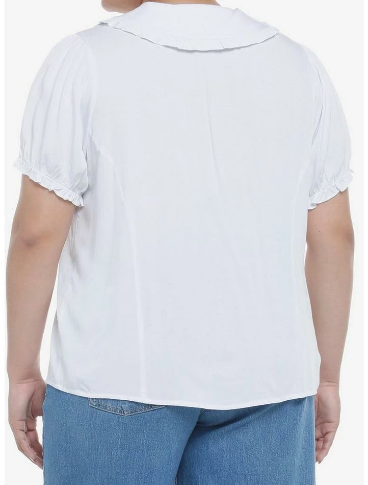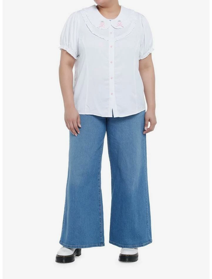 Keep it cute in this woven button-up featuring sweet details like heart-shaped buttons, ruffles, bib seaming and embroidered strawberries.