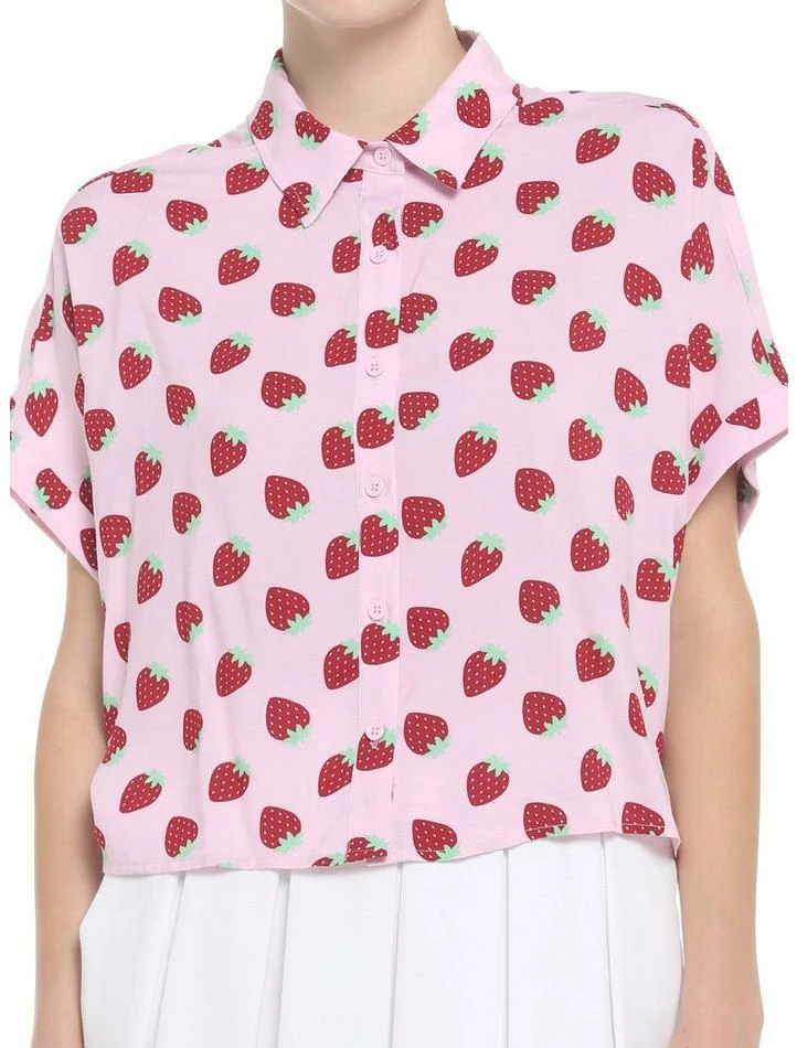 Berry much in need of a new top? This cropped woven button-up will hit the spot. It features an allover print of strawberries against a pastel pink fabric. It has cuffed sleeves.