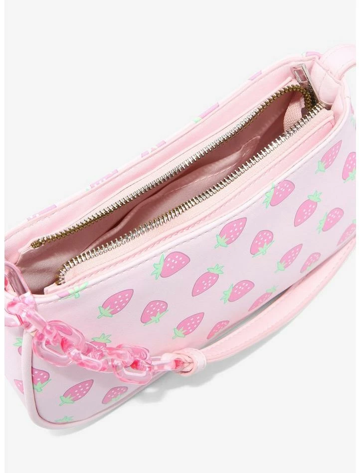 Thinking of adding a sweet new bag to your collection? We’ve got the perfect pick for ya! Make your look berry cute with this strawberry baguette bag, featuring an allover print of strawberries, plus chunky chain detailing on the strap. Comes with top zipper closure and interior drop pocket.