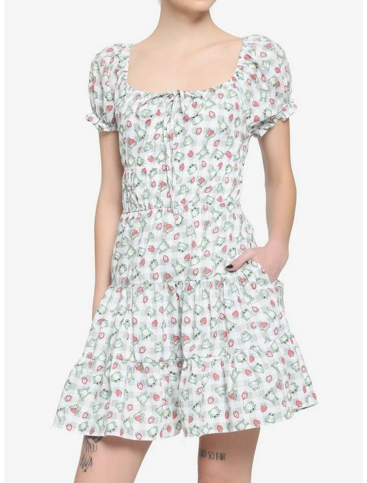 Heading out for a picnic in the forest? Hop into this dress, perfect for the occasion! This tiered gingham dress features an allover print of frogs and strawberries, tie front on chest, puff sleeves and pockets! Elastic waist detail and elastic trimming around neck.