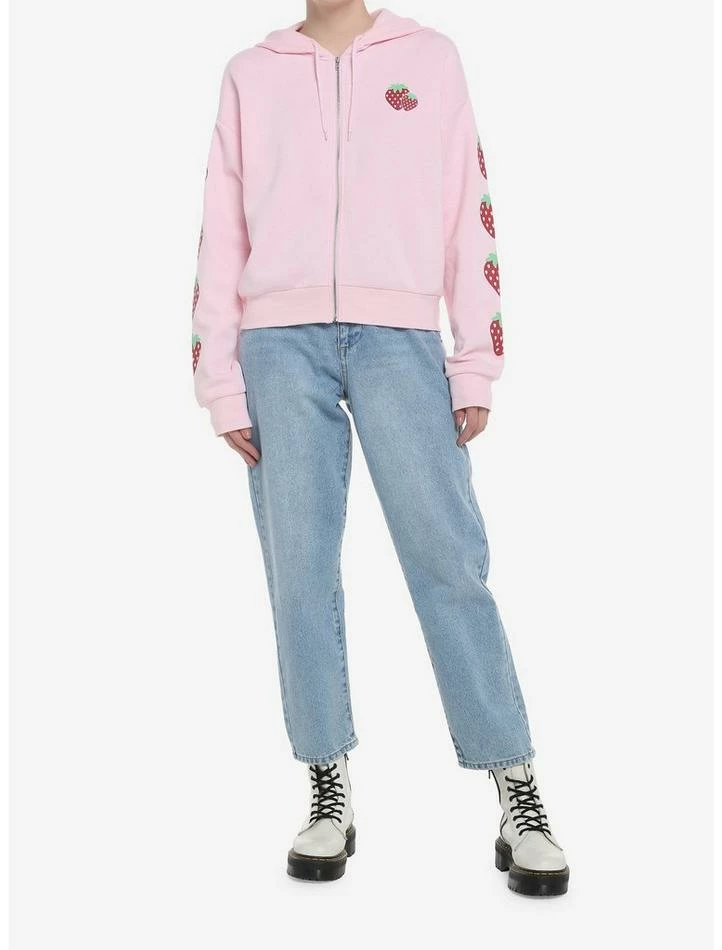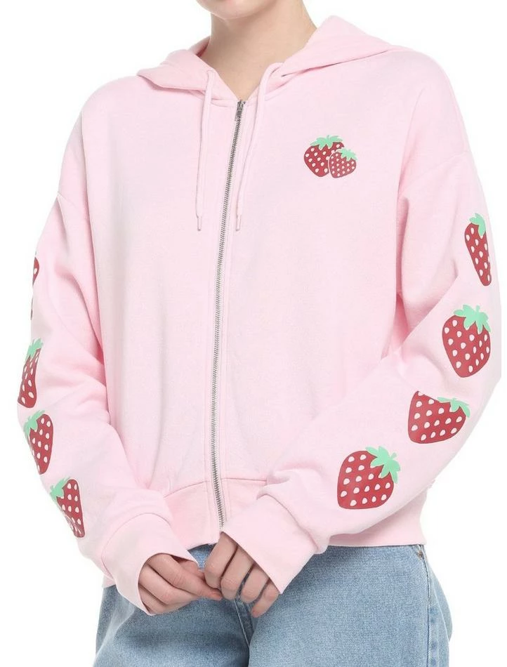 Berry comfy or berry cute? You can have both with this zip-up hoodie. It’s printed with strawberries on the chest and down the sleeves, with front pockets and a drawstring hood.