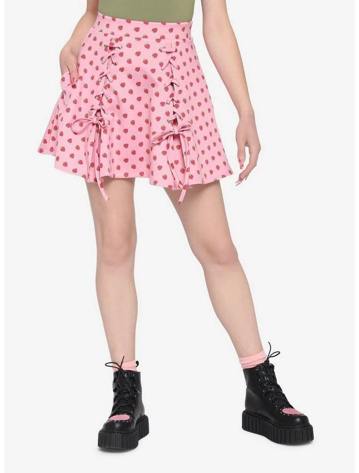 This skirt was freshly picked for you! It’s pink and features a strawberry print allover, double lace-up detailing, pockets and elastic waistband.
