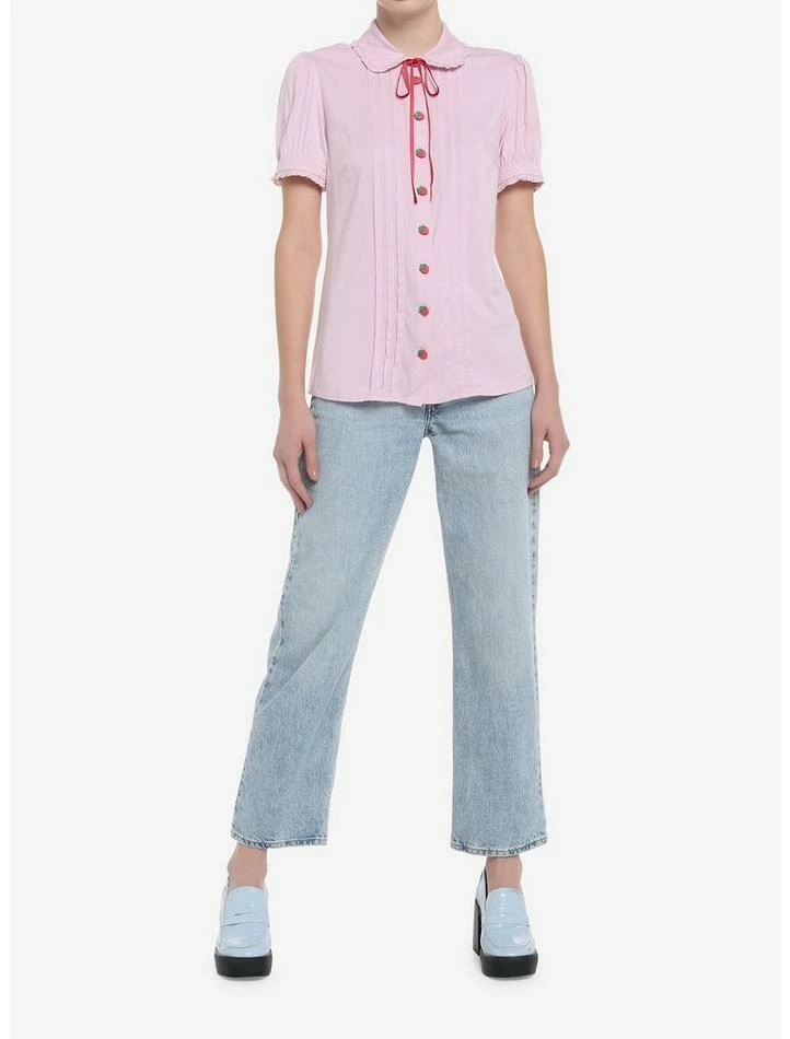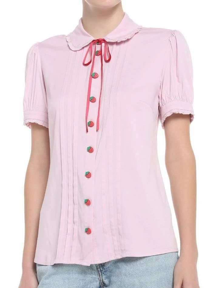 ย We have the perfect outfit for hanging out in strawberry fields forever. This pink woven button-up top has functional heart-shaped buttons, pleating on the front, ruffles at the collar and sleeves and a ribbon necktie.
