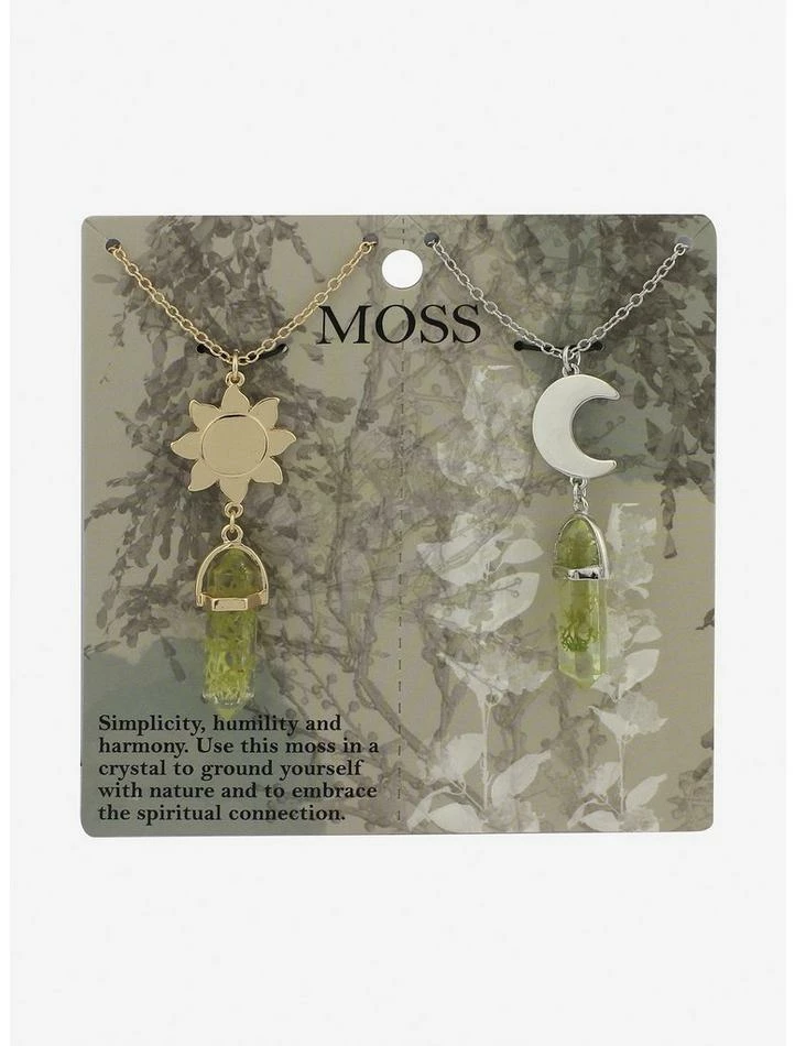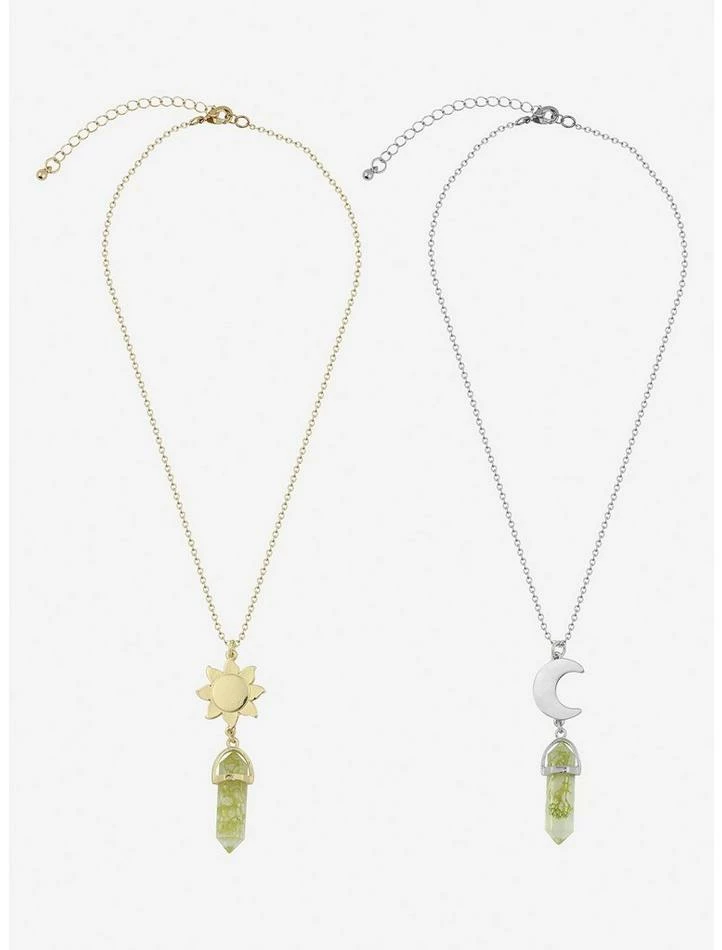 Got a bestie who complements you perfectly? Show them you care by sharing this BFF necklace set! Featuring a gold-tone sun necklace and a silver-tone moon necklace, both adorned with faux crystal moss charms.