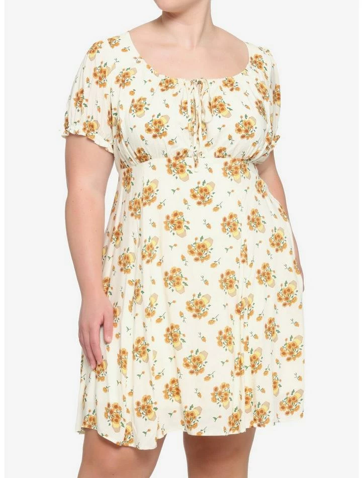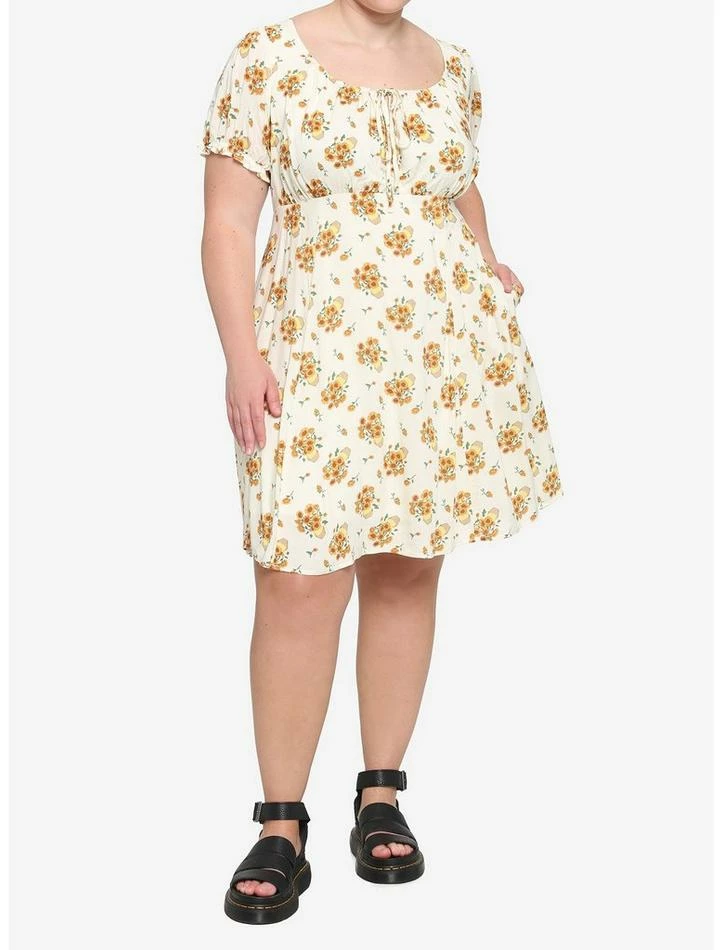 ย A new dress is in bloom! This ivory dress features a sunflower in a jar print inspired by van Gogh’s painting, empire waist, puff sleeves, pockets and back zipper closure.