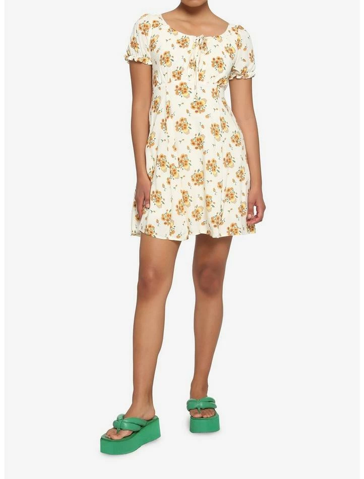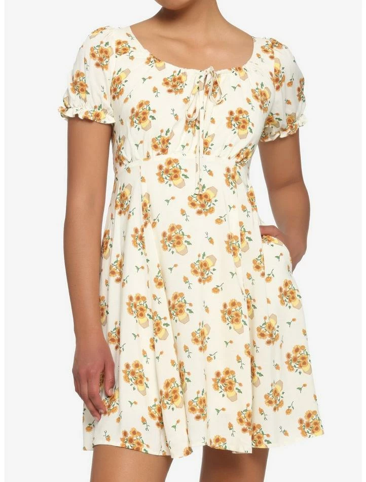 A new dress is in bloom! This ivory dress features a sunflower in a jar print inspired by van Gogh’s painting, empire waist, puff sleeves, pockets and back zipper closure.