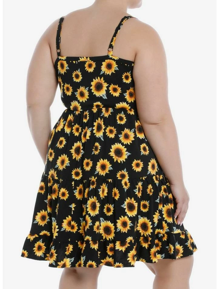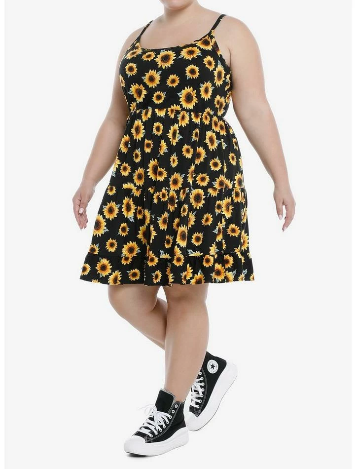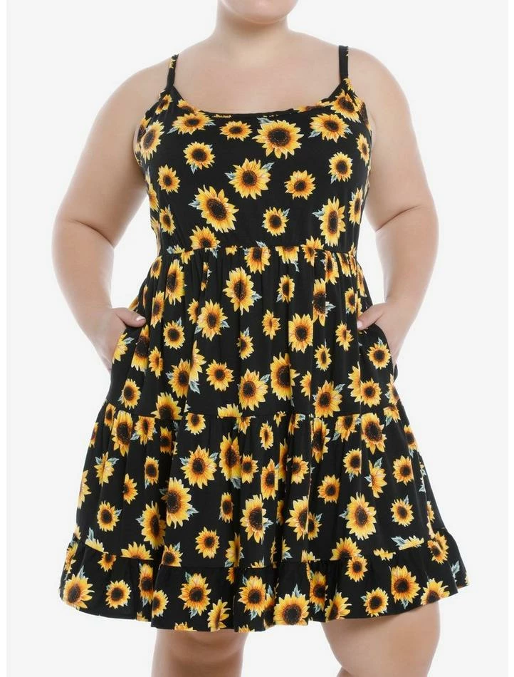 Make any day a sunshiney day in this strappy dress. The black dress is printed with the sunflowers all over, with a triple-tiered skirt design, adjustable straps and pockets.