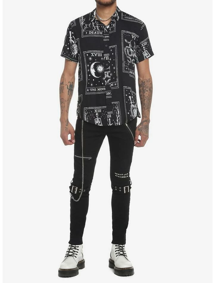 Going for a mystical vibe? This woven button-up shows some of the darker tarot cards in the deck, include The Snake and Death.