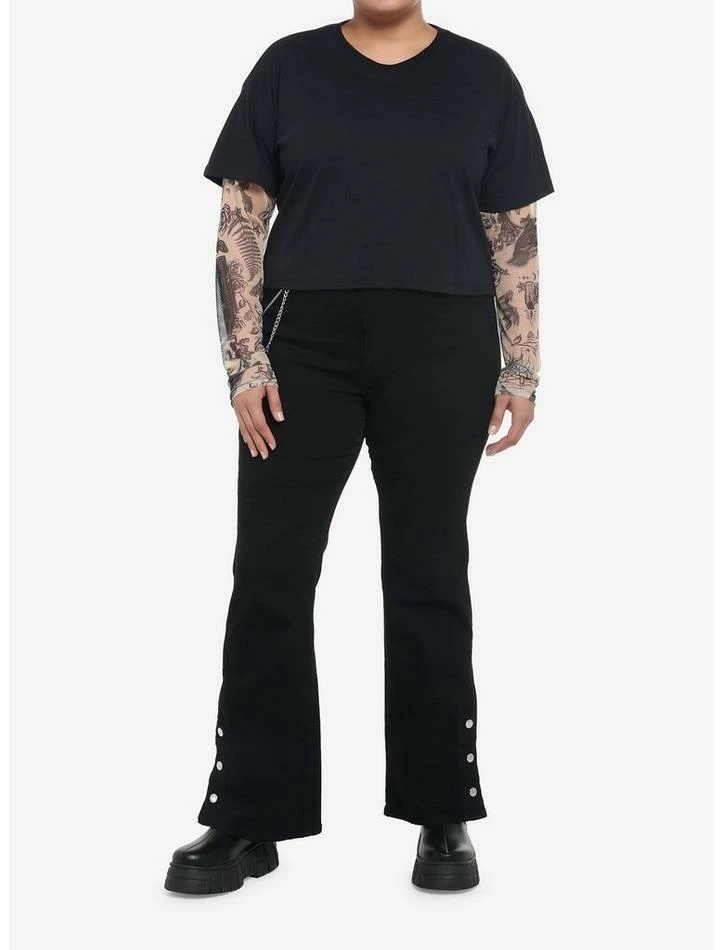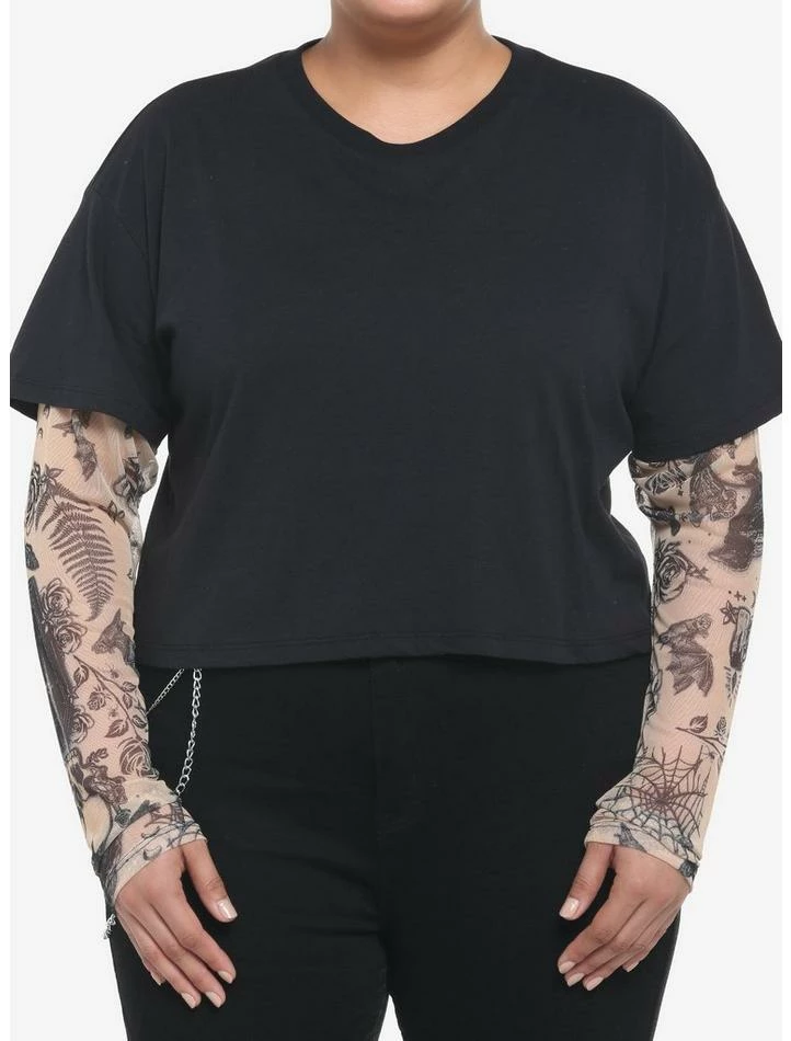 Ever wonder how you’d look with tattoo sleeves down your arms? We’ve got a non-permanent solution for ya! Add some edge to your black tees with this twofer mesh crop top, featuring skin tone mesh long-sleeves with tattoo-like art down both sleeves.