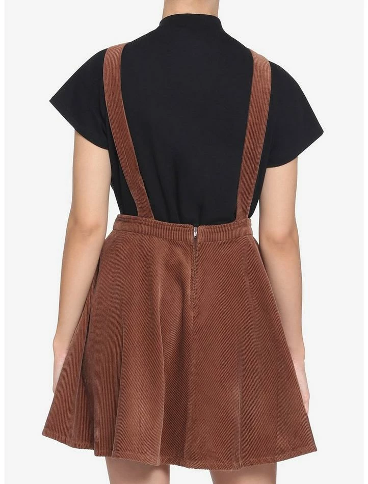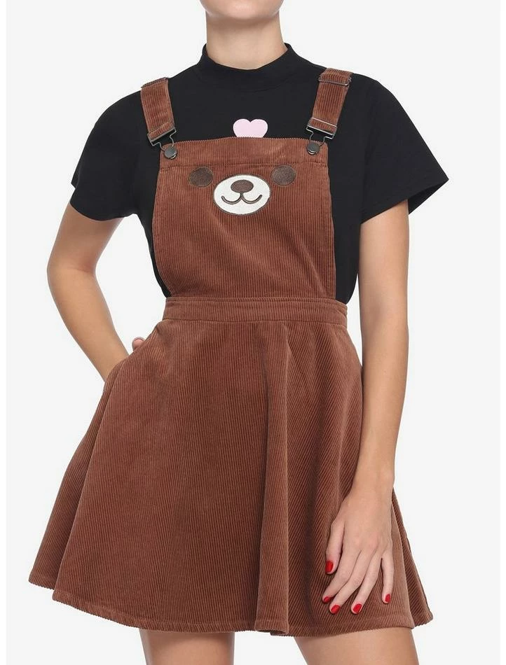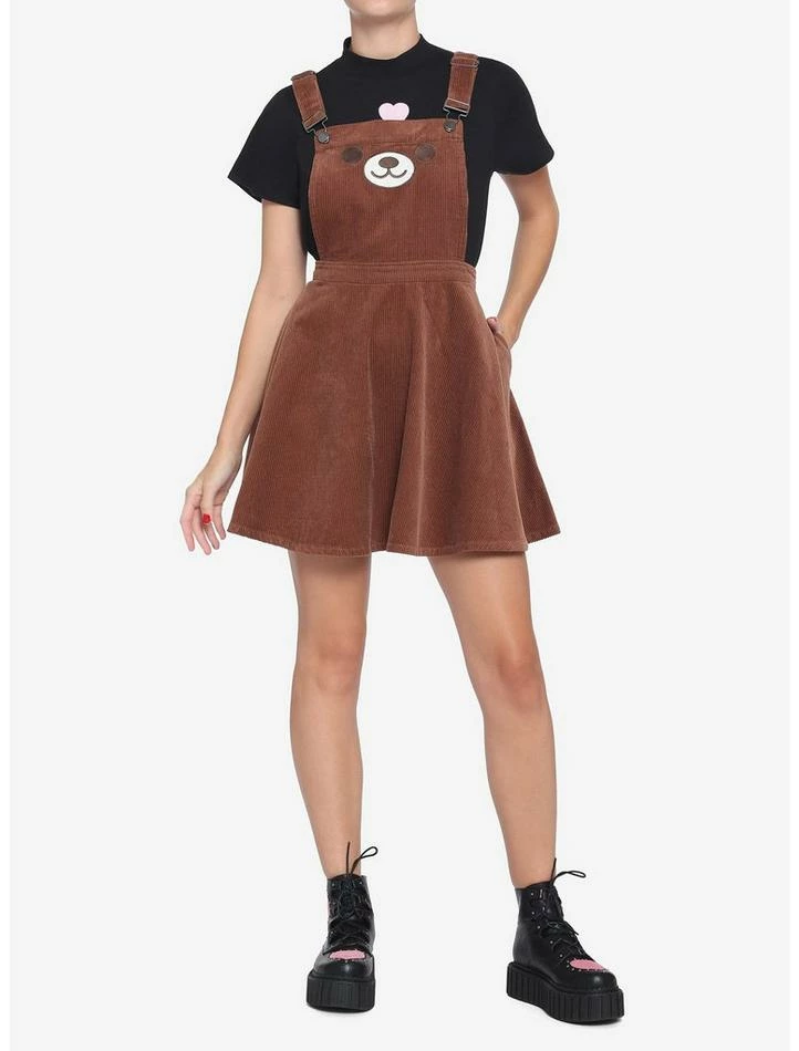 We’re all about this cozy and cute look! This brown corduroy skirtall features a teddy bear face on the bib, a skater skirt, pockets and adjustable straps.