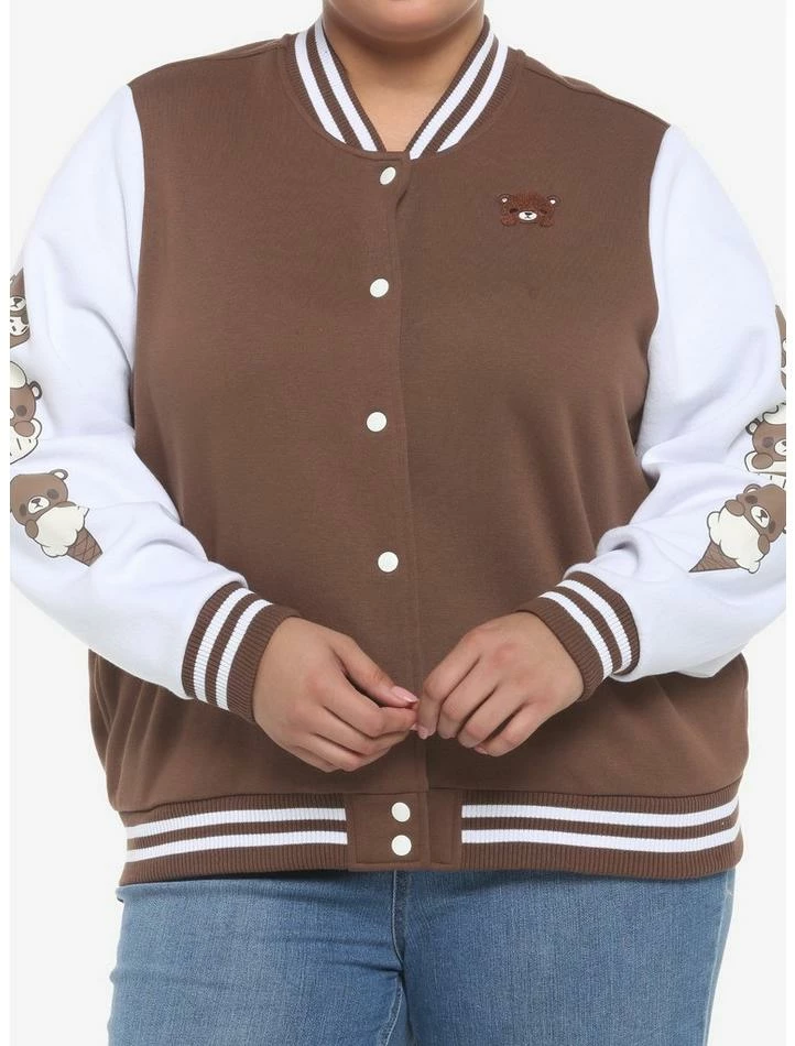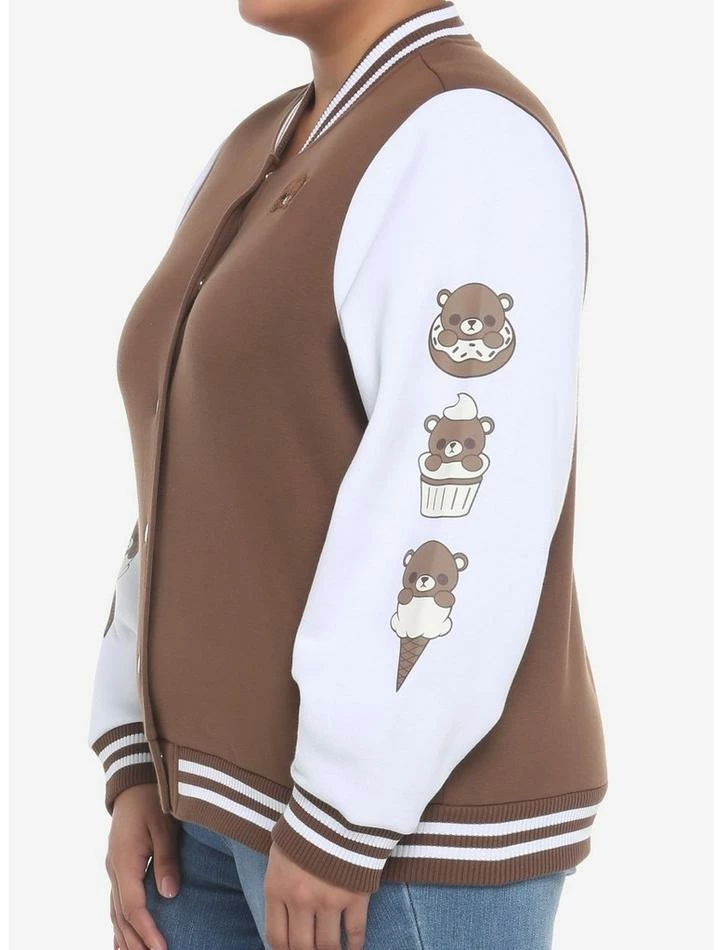 Add this supercute, super-kawaii bomber jacket to your winter wardrobe. It is chocolate brown and white, with graphics of teddy bear desserts down the sleeves. Button-front closure and side pockets.