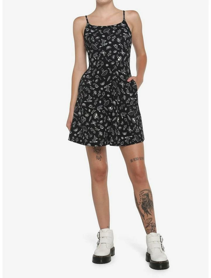 Going mushroom picking in the forest? Whether you’re going frolicking in the woods or attending a cottagecore picnic, this skater dress is a staple for your wardrobe! Featuring an allover toss of large mushrooms and other plants fresh picked from the woods. This dress comes with adjustable cami straps and hip pockets.