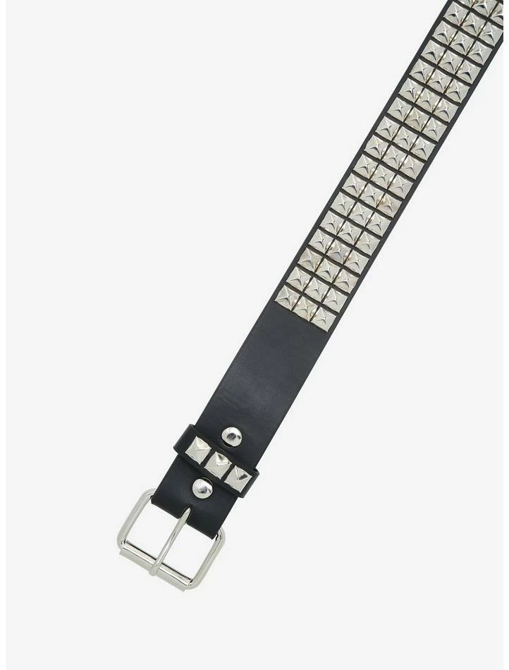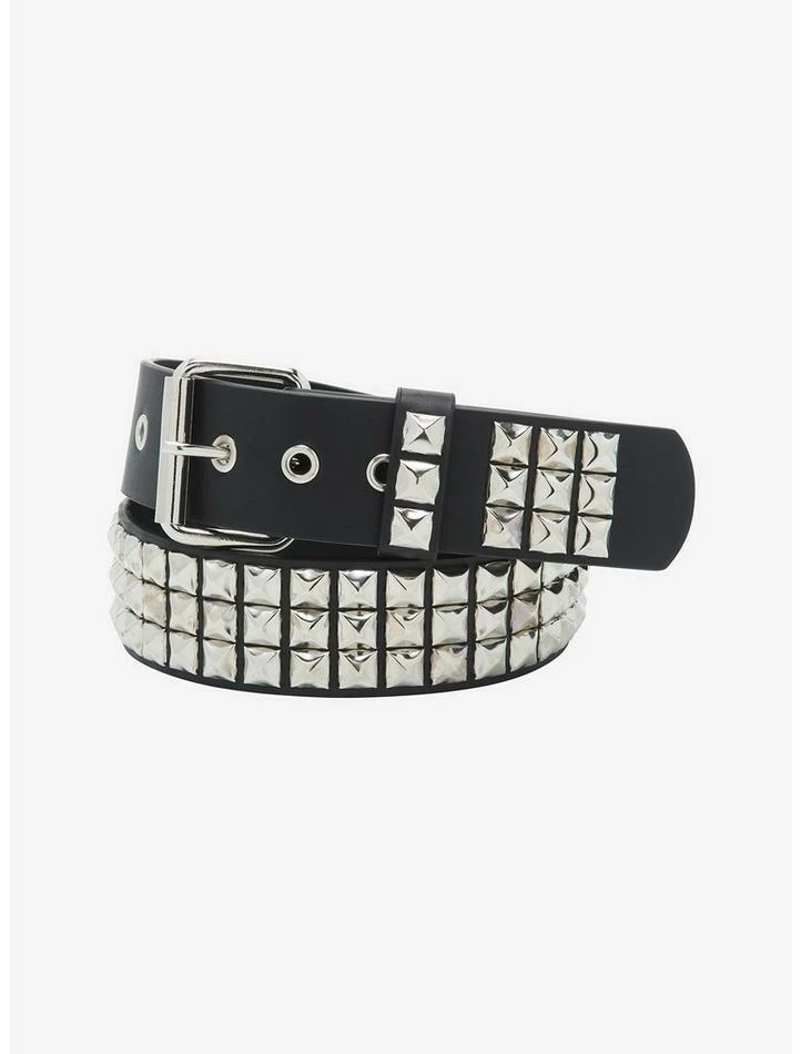 Bling out your ‘fit! This belt features three rows of silver-toned pyramid studs.