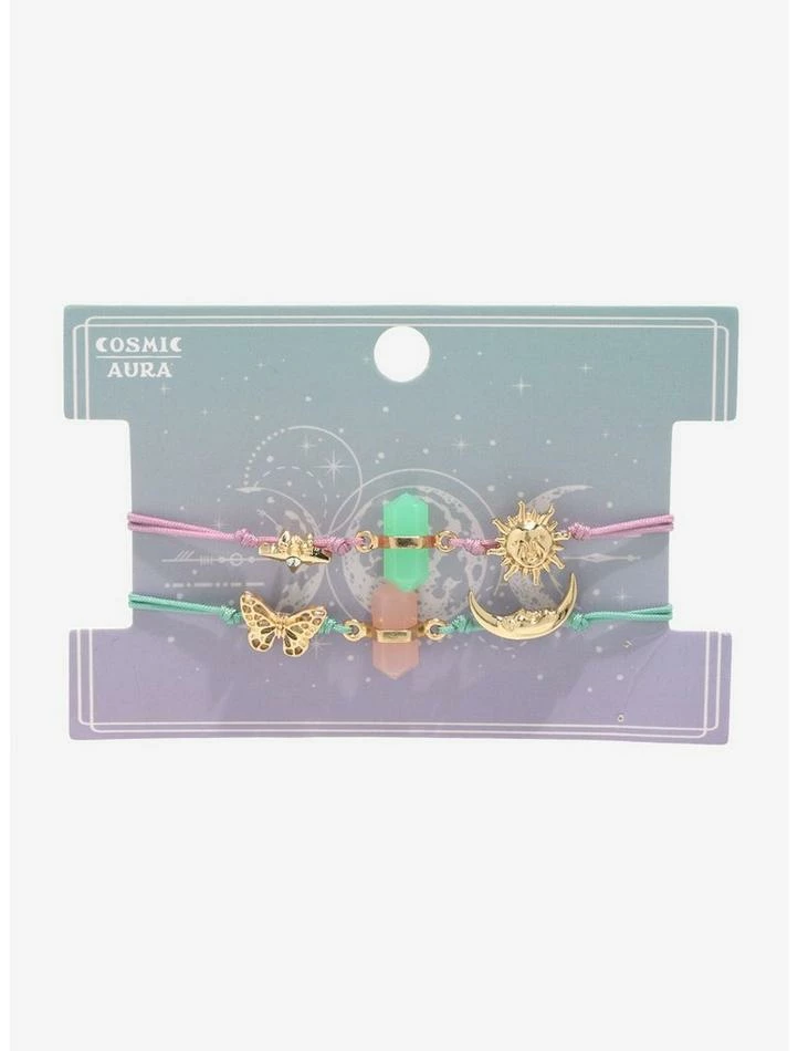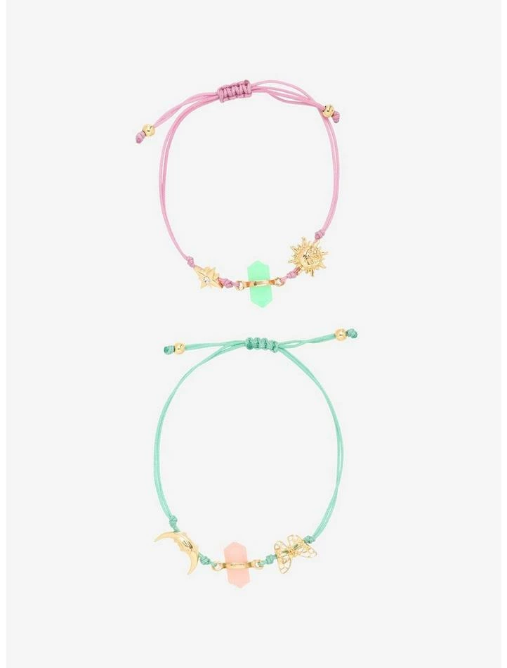 You and your bestie can take your matching jewelry to celestial levels with these cord bracelets! This colorful bracelet set features vibrant faux crystals surrounded by mystical gold-tone charms.