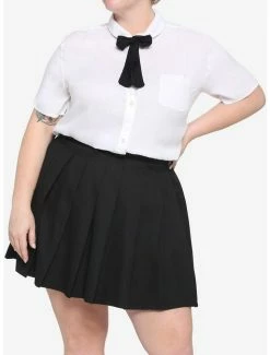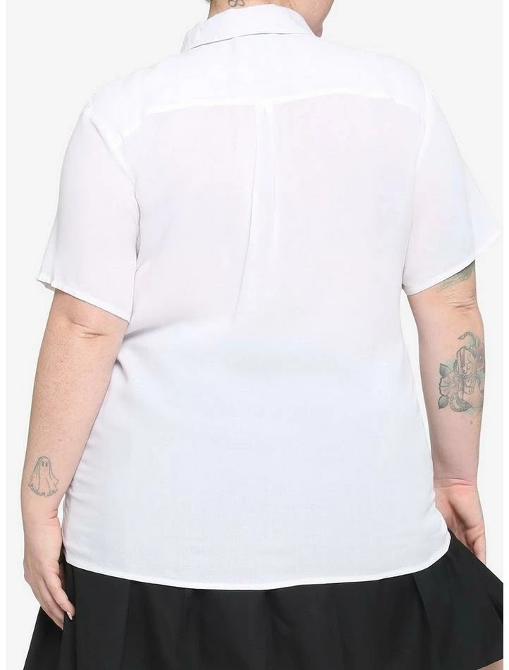 Rock that goth-school-girl look with this white, flowy resort button-up. It comes with a detachable black bow, clear buttons and a front chest pocket. Pair with a skirt and Mary Janes to complete your look!