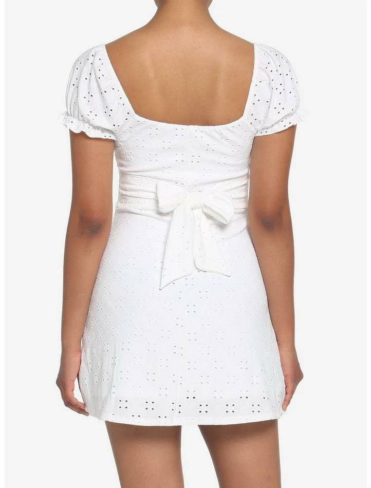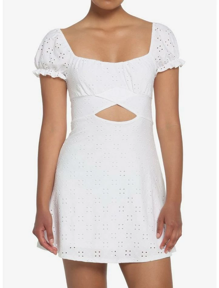 Summer means dress season. Grab this white dress featuring eyelet detailing, a front cutout and elastic neckline and sleeves.