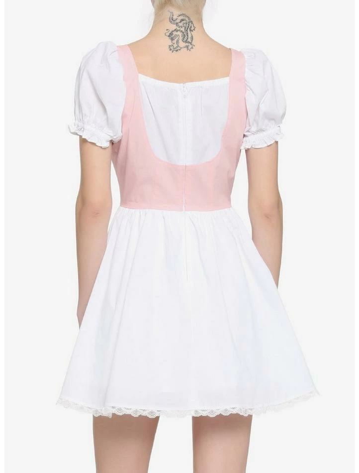 Make your soft girl dreams come true in this adorable dress! This supercute dress comes with pink under bust corset detailing, with lace-up satin ribbon and puff sleeves. There is lace along the trim and side seam pockets. Back zipper with hook-and-eye closure.