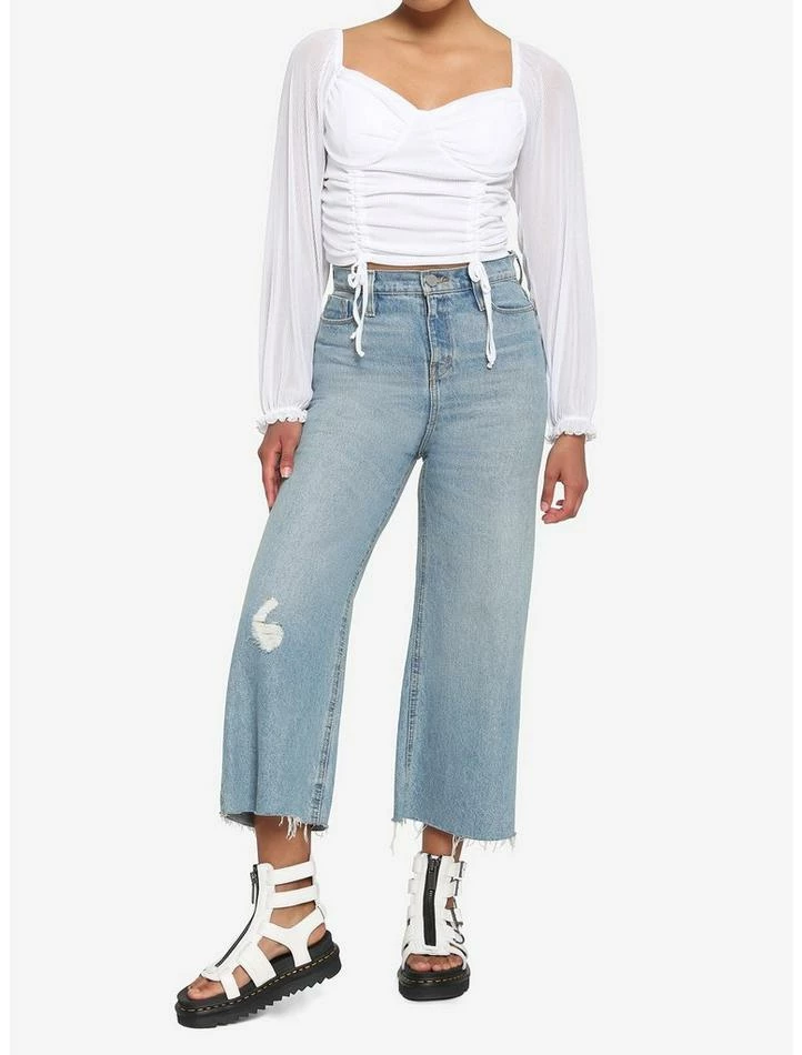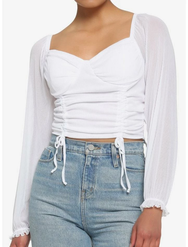 Keep your soft girl look goin’ strong with this white peasant top! It has a cropped fit and comes with built-in bra cups and double ruched detailing on the front. The sheer long-sleeves have ruffle trimming with elastic at the shoulder. Pair it with jeans or a mini skirt to complete your look!
